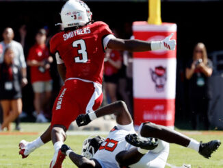October 4, 2025 The North State Journal College Football, North State Journal, sports Comments Off on Wolfpack smash Camels in blowout victoryNorth Carolina State running back Hollywood Smothers (3) breaks the tackle of Campbell’s Jojo Pace (8) on his way to a touchdown during the first half of an NCAA college football game in Raleigh, N.C., [...] -